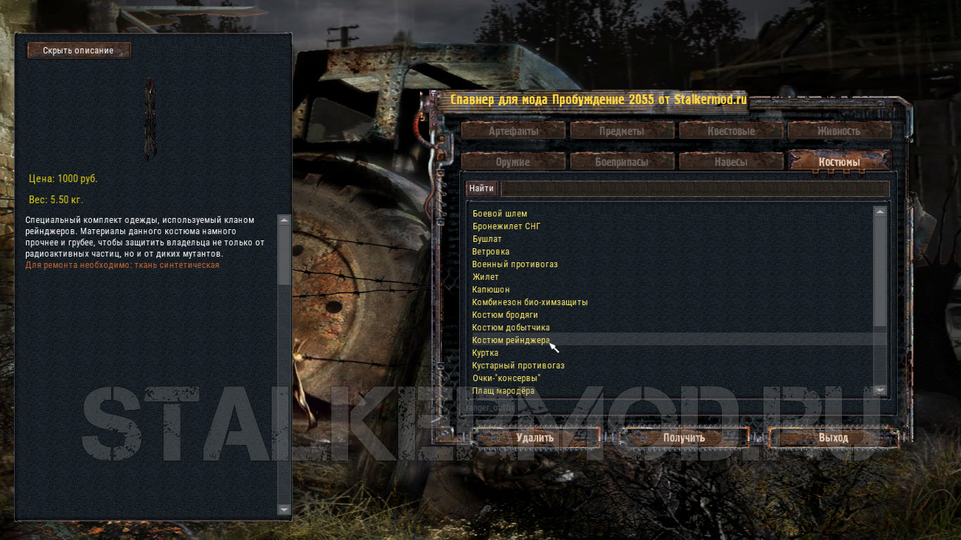 Исправить ситуацию и посмотреть все новинки вооружения, детекторов и устройств поможет спавнер для мода Пробуждение 2055.